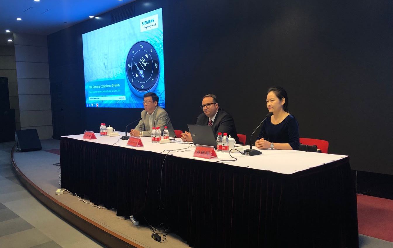 经教研中心刘霄仑副教授推荐,4月25日晚,研究生部邀请到了西门子(中国)有限公司副总裁兼合规总监马赛尔(Marcel Radunski)先生以及油气与电力集团合规官吴锦源女士来院为研究生带来了主题为“西门子合规实践分享”的精彩讲座。